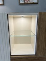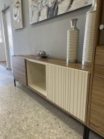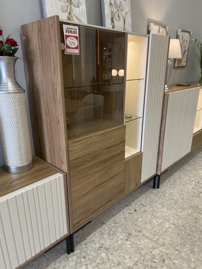 Composición de salón formada por bajo tv, aparador y bodeguero.